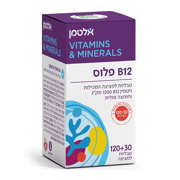 ויטמין B12 פלוס בתוספת חומצה פולית. טבליות מציצה לספיגה מהירה מתחת ללשון בטעם דובדבן